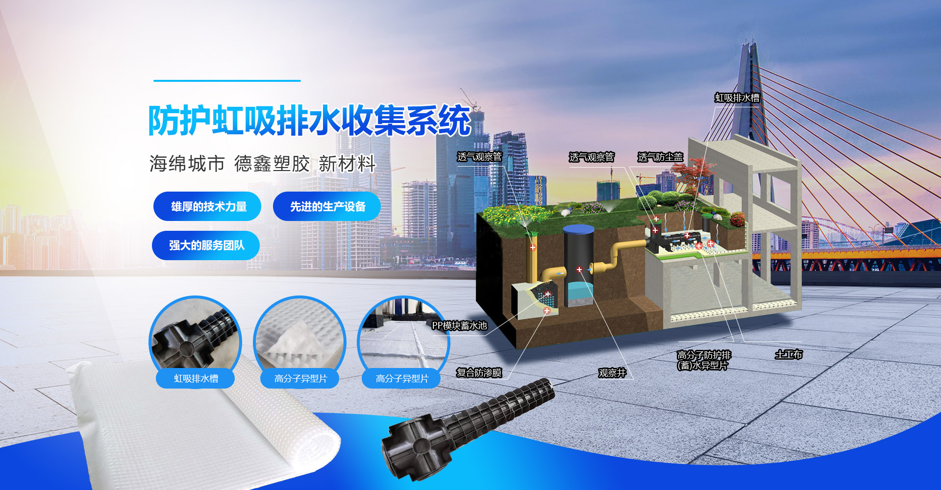 虹吸排水系統(tǒng) 雨水收集系統(tǒng) PP蓄水模塊 土工膜 復合土工膜 防水板 塑料盲溝管 防排水板 蓄排水板 土工布 土工格柵 土工格室 溢水格柵 生態(tài)袋 土工席墊 植草格 植草盆 線性排水溝 萬能支撐器 三維植被網(wǎng)
